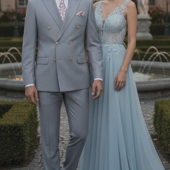 Pair this silver suit with a crisp white dress shirt, a bold patterned tie, and polished black or brown shoes for a complete formal ensemble that radiates class and confidence.