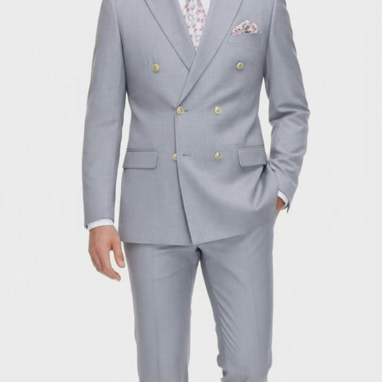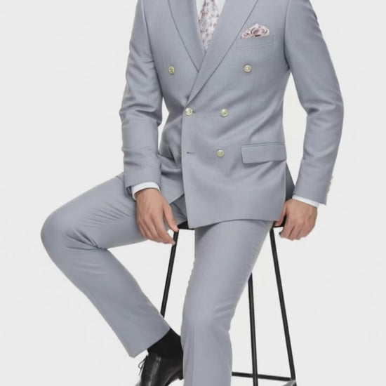 Mens Silver Grey Double-Breasted 3-Piece Suit – Classic Tailored Fit with Peak Lapel and Gold Buttons for Weddings, Church and Formal Events