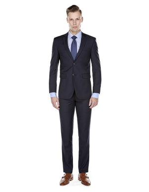 This skinny fit suit is a good navy blue suit for a funeral. It features a standard 2 button closure, back side vents on the jacket, and flat fron pants.