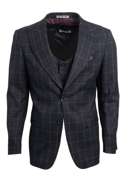 Jacket: Windowpane hybrid fit single breasted with two button closure, peak lapel, and three side flap pockets.