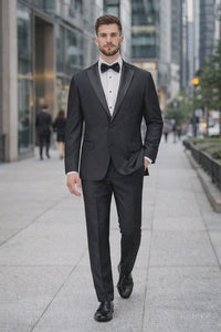 Mens Tiglio Modern Fit Black Wool Tuxedo – Classic Satin Lapel Formal Suit