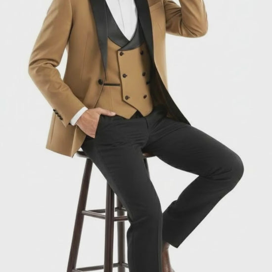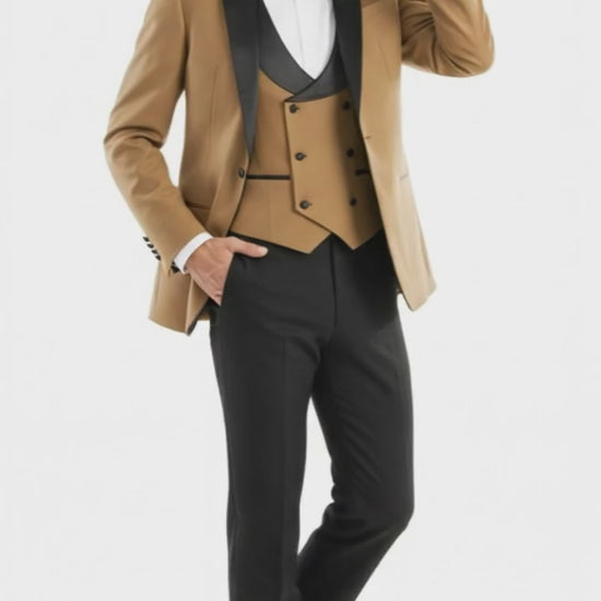 - Color: Tan jacket and vest with black lapel and trousers
