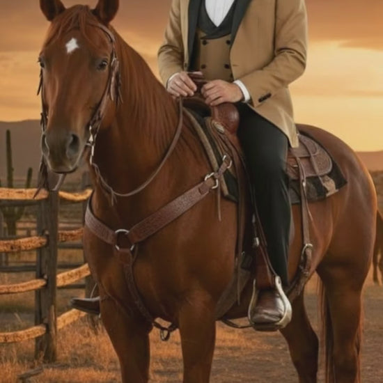 Command attention with this Men’s Western Cowboy Tuxedo, a perfect fusion of rugged western style and refined formalwear. Designed for the modern cowboy with classic taste, this tan and black 3-piece suit includes a tailored jacket, a matching double-breasted vest, and sleek black trousers — ideal for weddings, formal events, rodeos, or western-themed celebrations.