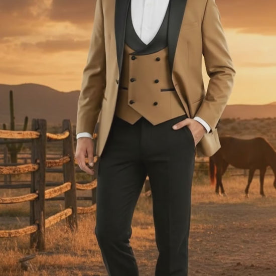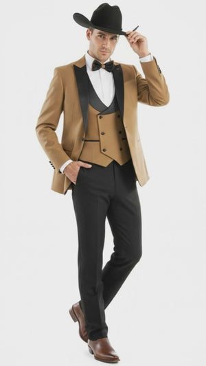 Mens Western Cowboy Tuxedo – Tan and Black 3-Piece Suit with Satin Lapel and Vest in Mocca Coffee Color