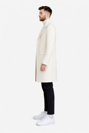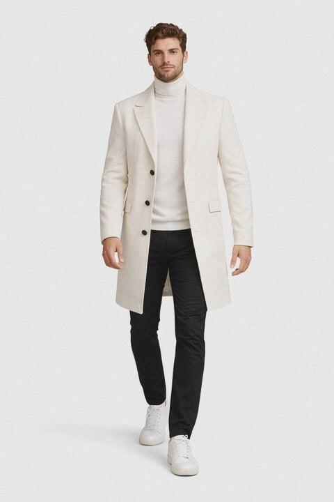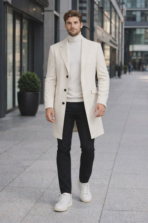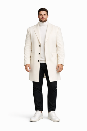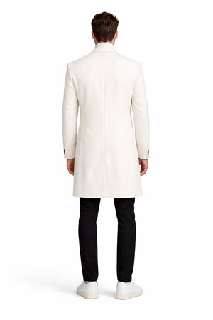 Beyond its elegant appearance, this white topcoat for men offers practical functionality. Designed to balance warmth with lightweight comfort, it serves as a dependable winter coat without feeling bulky. Its timeless design ensures it remains a staple in your wardrobe season after season, transcending trends while maintaining contemporary appeal. The structured lapels and clean button closure further emphasize its classic menswear roots while allowing flexible styling options.