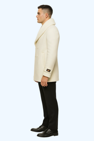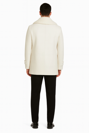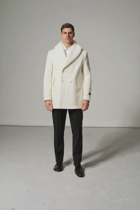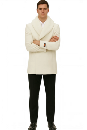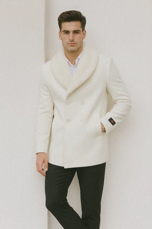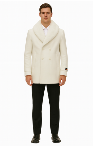 Mens White Peacoat Double-Breasted Overcoat with Faux Fur Shawl Collar – Alberto Nardoni Collection Wool Fabric