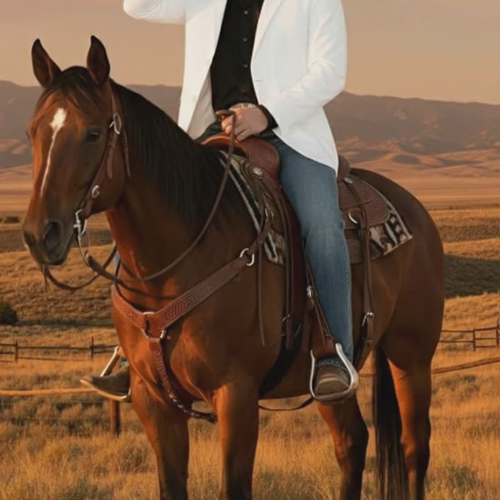 - Stand out with timeless cowboy style in this white western blazer, the perfect blend of rugged elegance and modern flair.