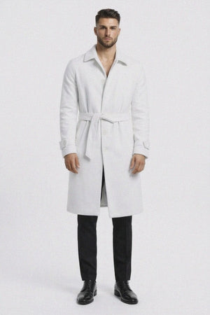 The crisp white color creates a bold yet refined appearance, making this coat ideal for weddings, formal parties, evening events, and upscale gatherings. The belted design enhances the overall silhouette while allowing adjustable comfort and versatile styling. Whether layered over a suit or styled with dresswear, this long coat adds sophistication to any outfit.