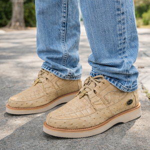 Expertly crafted using genuine caiman leather and authentic ostrich skin, these Wild West boots showcase exceptional texture, strength, and character. The caiman leather provides a bold, rugged appearance with natural scale patterns that symbolize power and prestige, while the ostrich skin adds a refined contrast with its distinctive quill texture and soft, durable finish. Together, these exotic materials create a visually striking boot that stands apart from standard western footwear.