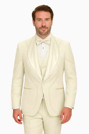 Exude timeless elegance with the Off White Italian Wool 3-Piece Tuxedo, tailored in a Modern Fit that perfectly balances sophistication with comfort. The refined off white shade offers a distinguished and versatile look, making it ideal for weddings, formal celebrations, and high-profile events. Crafted from premium Italian wool and enhanced with subtle stone detailing, this tuxedo ensures you stand out with understated luxury.