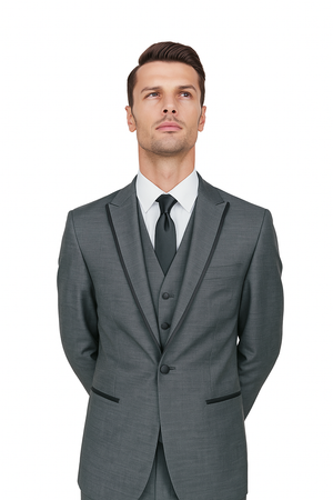 This Oscar Tuxedo with a sleek black satin lapel border is a timeless choice for any formal occasion. Designed with precision, it features contrasting satin details on the lapels, buttons, trousers, and pockets, adding a refined touch. The set includes a sharp one-button jacket, adjustable flat-front trousers, and a five-button vest for a complete polished look. Crafted from a medium-weight blend of Italian polyester and viscose with Super 150’s Poly-Rayon, it offers both comfort and durability. The fully lined jacket ensures structure, while the trousers come with an unfinished hem for a tailored fit.