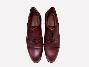 Elevate your footwear collection with this refined cap toe oxford, distinguished by its striking burgundy hue and meticulous hand-finished details. The carefully crafted cap toe design adds timeless sophistication to any ensemble, while the rich burgundy tone offers versatile styling possibilities. Perfect for the discerning gentleman seeking quality craftsmanship and understated elegance in every step.