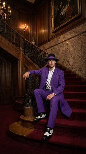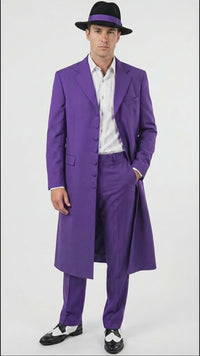 Make a bold statement with this purple zoot suit for men, inspired by classic mafia, gangster, and vintage 1920s–1940s fashion. Designed for standout style, this elegant outfit features a long tailored coat with structured shoulders, matching trousers, and a timeless silhouette that reflects true old-school sophistication.