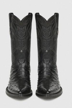 Step into refined Western luxury with our Black Pointed Toe Ostrich Boots, a bold statement of craftsmanship, sophistication, and timeless style. Designed for men who appreciate premium materials and distinctive footwear, these boots combine exotic elegance with classic cowboy heritage. Whether you're dressing for a formal occasion, a night out, or elevating your everyday look, these black ostrich boots deliver unmatched presence and confidence.