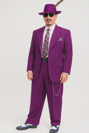 Turn heads with this bold Purple Pinstripe Zoot Suit, inspired by the iconic gangster fashion of the 1920s and 1930s. Whether you’re dressing for a Gatsby-themed party, a vintage wedding, prom, or a stage performance, this three-piece outfit delivers style, confidence, and classic retro flair.