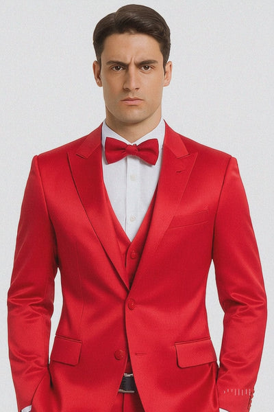 Elevate your formal wardrobe with the red satin texture double breasted vest peak lapel 3 piece skinny fit Tazzio men's suit with matching bowtie, designed for modern elegance and timeless sophistication. Crafted with premium satin fabric, this three-piece suit combines luxury and style, making it the perfect choice for weddings, receptions, formal events, and special occasions. The rich red satin texture adds a touch of bold refinement, while the expertly tailored skinny fit ensures a sharp, contemporary silhouette that complements the modern gentleman.