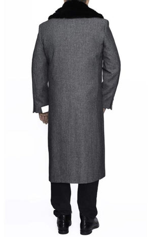 Removable Fur Collar Full Length Wool Dress Ankle length Overcoat In Grey Herringbone