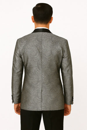 Step into the spotlight with this Paisley-300 Silver and Black Tuxedo Blazer, a bold statement piece tailored for upscale events and unforgettable moments. Featuring a rich metallic silver paisley pattern over a sleek black base, this blazer is designed to impress with its intricate detailing and refined sophistication.