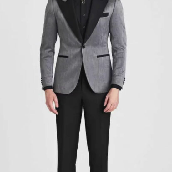 Silver Metallic Tuxedo Suit with Black Satin Peak Lapel – Mens Slim Fit Formal Wedding and Prom Attire in Charcoal Grey With Pants