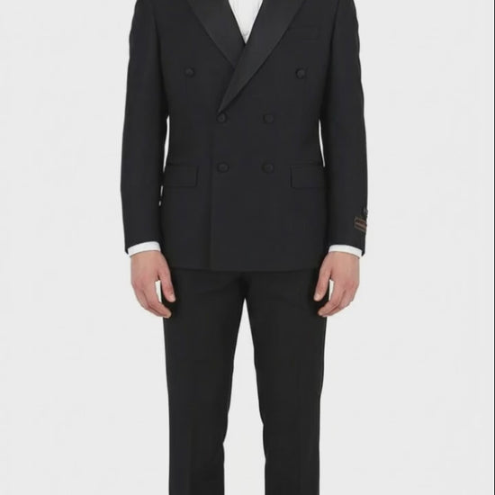 Tiglio Brand 100% Wool Super 150s Italian fabric Men’s Classic Black Double-Breasted Tuxedo with Satin Peak Lapel – Formal Wedding & Gala Suit Set