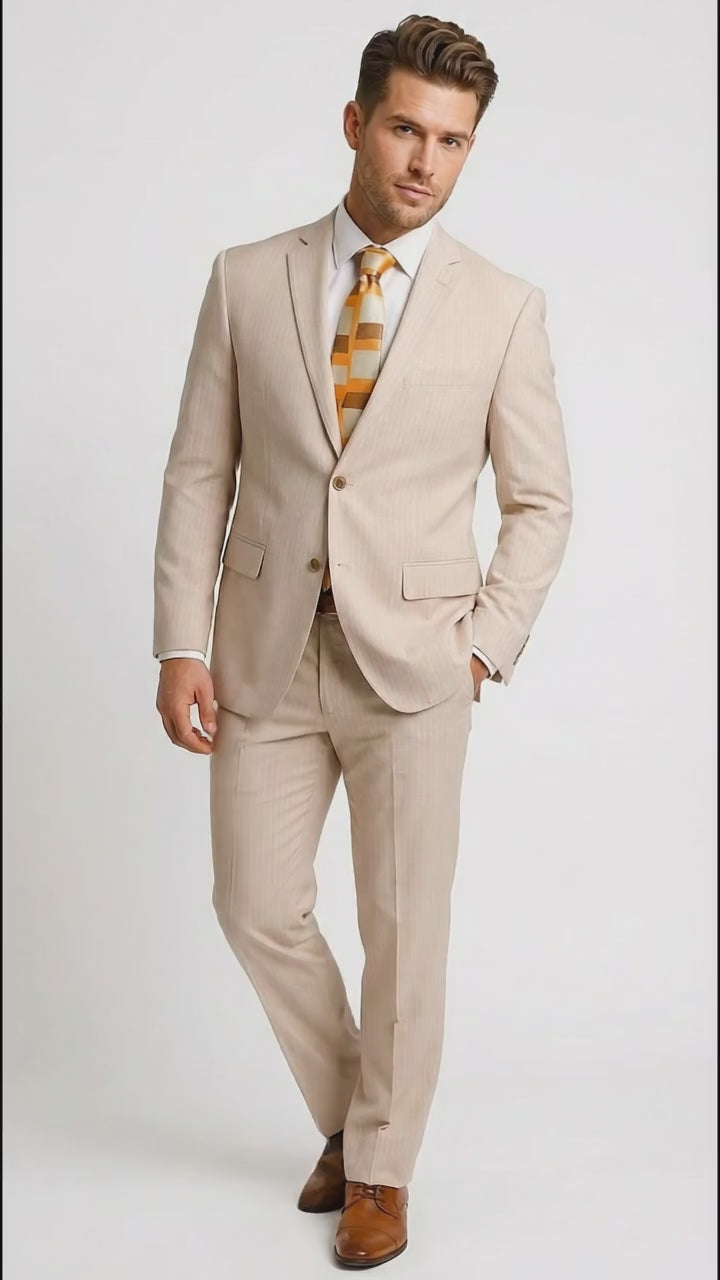Vitali Men’s Natural Beige Pinstripe Suit – Summer Tan Pinstripe Weddings and Business Wear