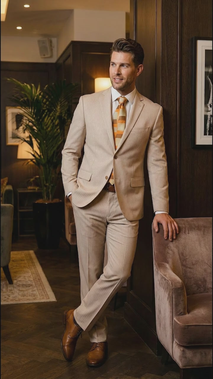 This men’s natural beige formal suit is a smart choice for anyone looking to achieve a professional, elegant, and confident appearance.
