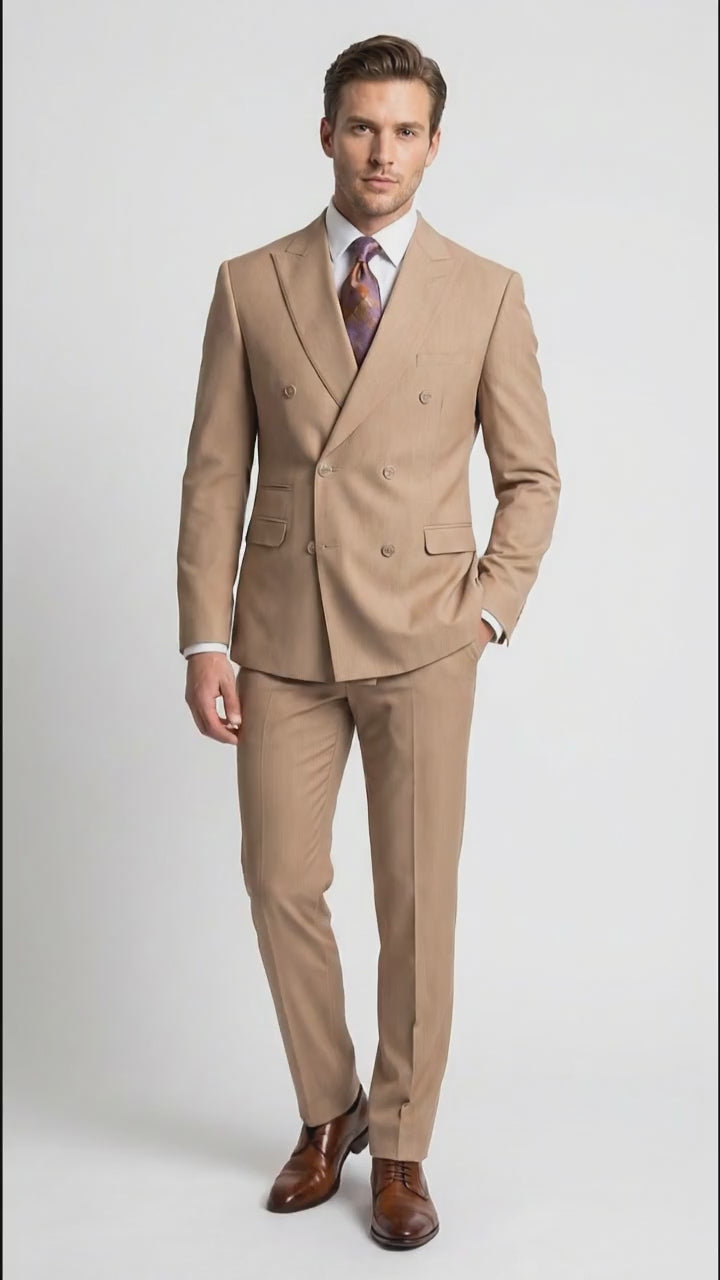 Add the Vitali Tan Double Breasted Suit to your collection for a premium men’s formal suit that combines classic tailoring, versatile color, and standout sophistication.