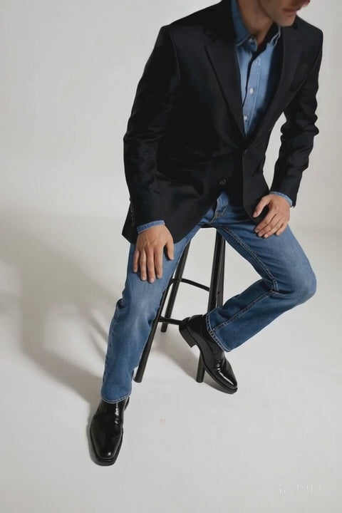 Style with dark denim jeans and a button-up shirt for a smart-casual outfit.
