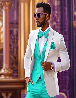 White and Turquoise Tuxedo Wedding Suit - White Dinner Jacket + Vest + Pants + Bow-tie